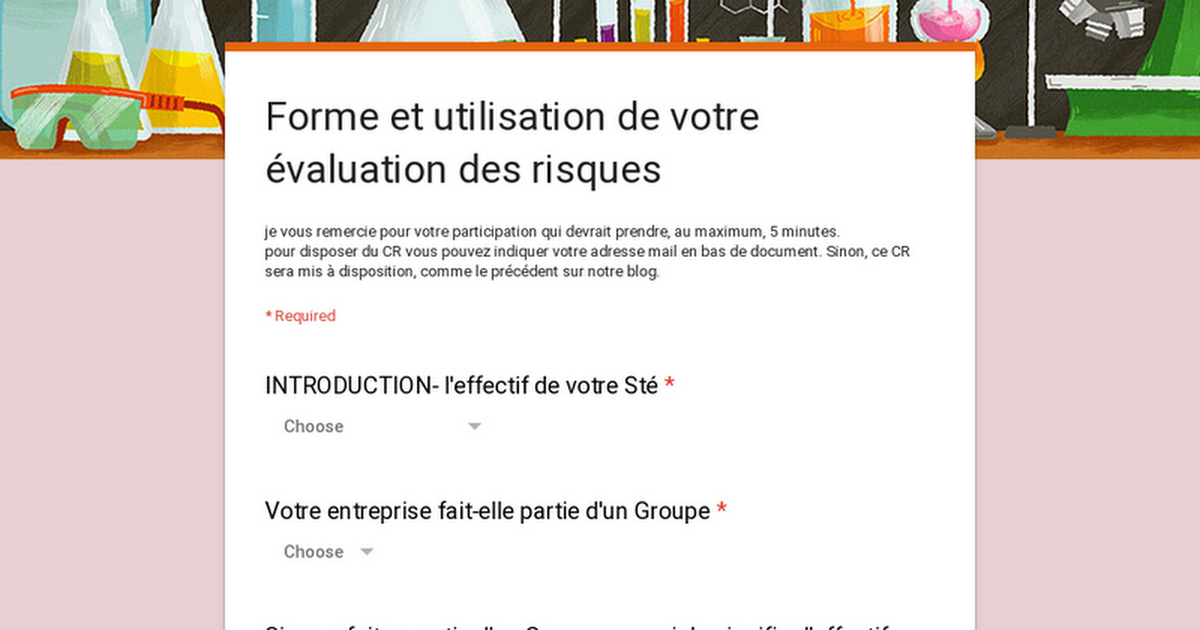 Forme et utilisation de votre évaluation des risquesje vous remercie pour votre participation qui devrait prendre, au maximum, 5 minuteshttps://docs.google.com/forms/d/e/1FAIpQLScW2lnxHMvB6UpXLNFG3icYK2nI3VZKz4tYh0tNH3z8g4jUcw/viewform?usp=send_form Bonjour,comme l'année dernière, je renouvelle…